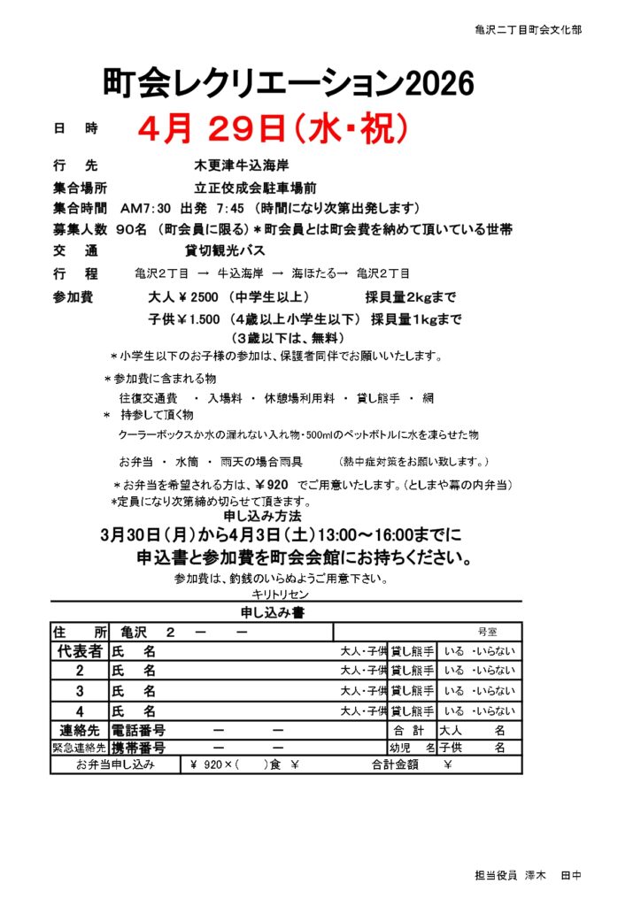 町会レクリエーション2026(潮干狩り)のご案内です。町会員限定の行事になります。